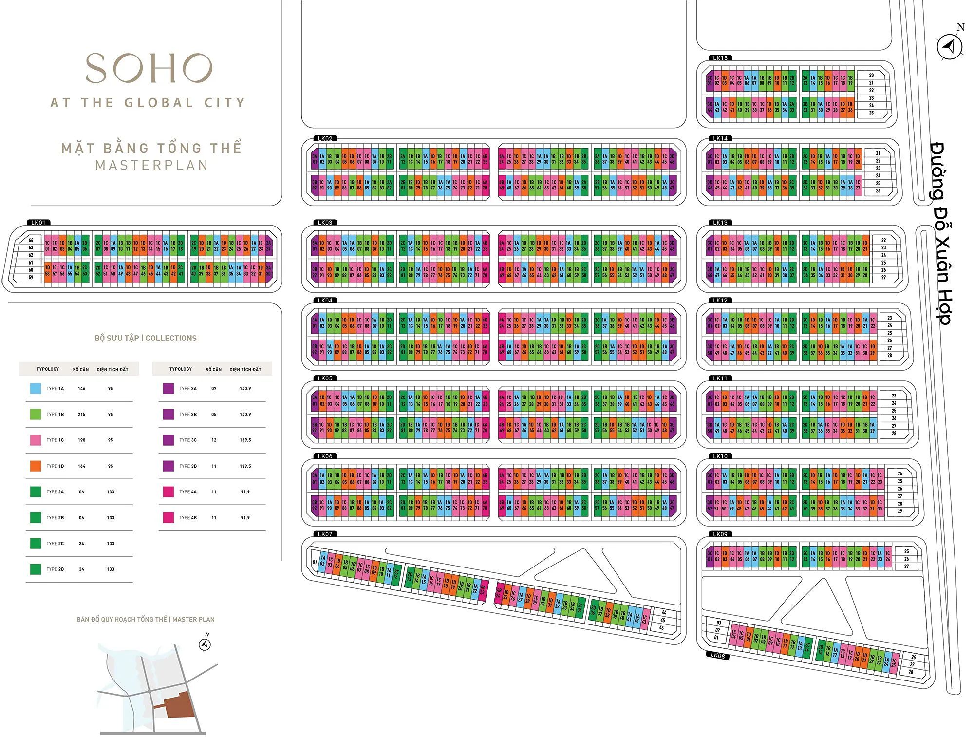 Phân khu SOHO tại The Global City được quy hoạch theo mô hình phố thương mại hiện đại, với layout bố trí theo dạng block liền kề đồng bộ, tạo nên các tuyến phố kinh doanh sôi động và dễ nhận diện. Toàn khu được chia thành nhiều cụm block như LK01 – LK15, bố trí dọc theo các trục đường nội khu và kết nối trực tiếp với đường Đỗ Xuân Hợp, giúp gia tăng khả năng tiếp cận và lưu lượng khách hàng.