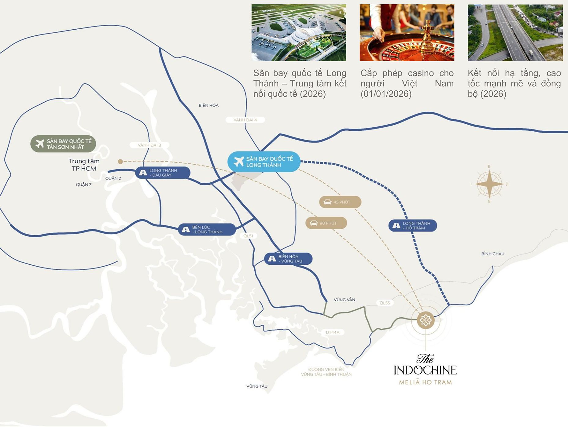 Tọa lạc tại Hồ Tràm – thủ phủ nghỉ dưỡng biển cao cấp phía Nam, The Indochine Collection sở hữu lợi thế vị trí mà rất ít dự án có được. Từ đây, cư dân và du khách có thể dễ dàng kết nối về TP.HCM chỉ trong khoảng 90 phút di chuyển, đồng thời hưởng lợi trực tiếp từ hệ thống hạ tầng giao thông ngày càng hoàn thiện, đặc biệt là sân bay quốc tế Long Thành trong tương lai gần.