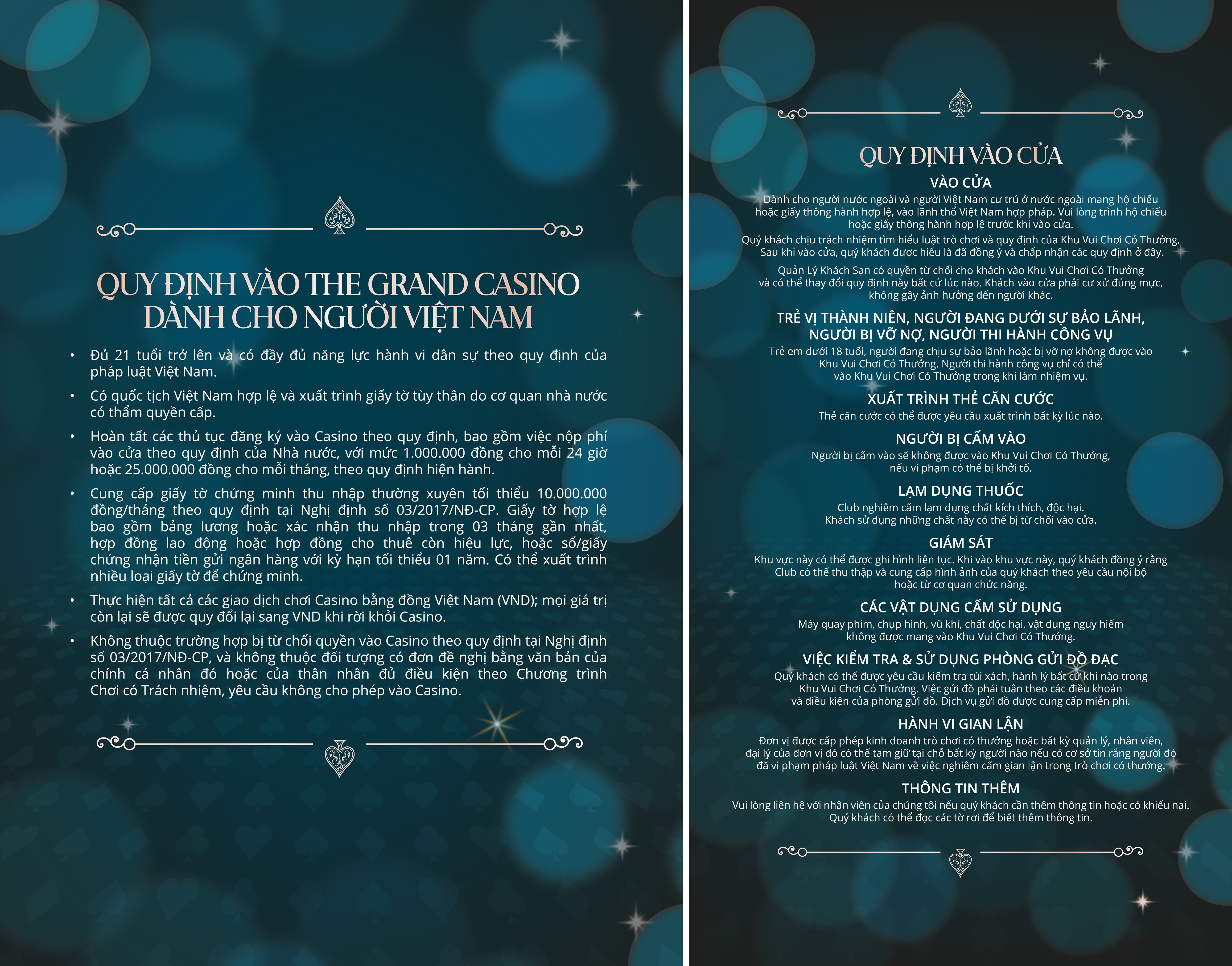 Việc cho phép khách Việt tham gia Casino tại The Grand Ho Tram không mang tính đại trà mà được triển khai theo nguyên tắc kiểm soát chặt chẽ, nhằm đảm bảo tính lành mạnh của hoạt động giải trí có thưởng. Khách tham gia cần đáp ứng đầy đủ các điều kiện theo quy định của pháp luật Việt Nam, bao gồm độ tuổi, năng lực hành vi dân sự, hồ sơ giấy tờ hợp lệ và nghĩa vụ tài chính theo quy định hiện hành.