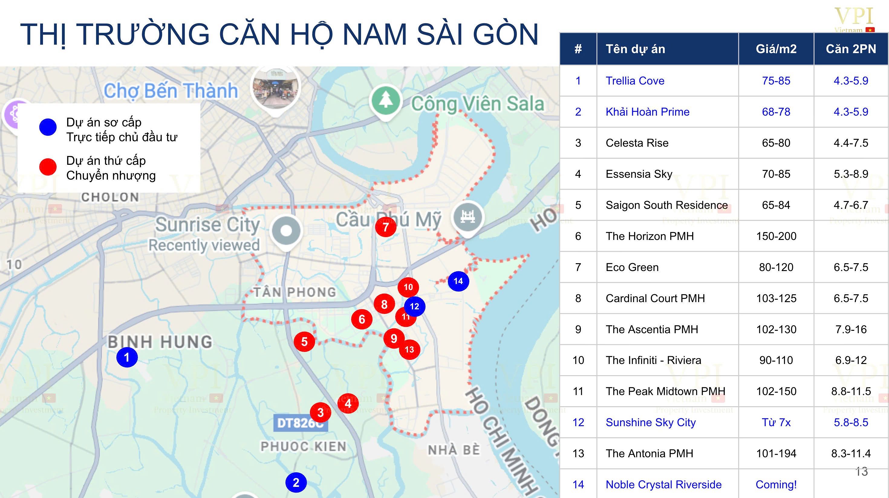 Các dự án như Trellia Cove, Khải Hoàn Prime, Celesta Rise hay Saigon South Residence ghi nhận mức giá 2PN trong khoảng 4,3–7,5 tỷ đồng, phù hợp với nhóm khách mua ở thực, gia đình trẻ và nhà đầu tư trung hạn. Trong khi đó, các dự án cao cấp tại Phú Mỹ Hưng có giá căn 2PN từ 8–16 tỷ đồng, phản ánh rõ sự khác biệt về đẳng cấp sống và cộng đồng cư dân.