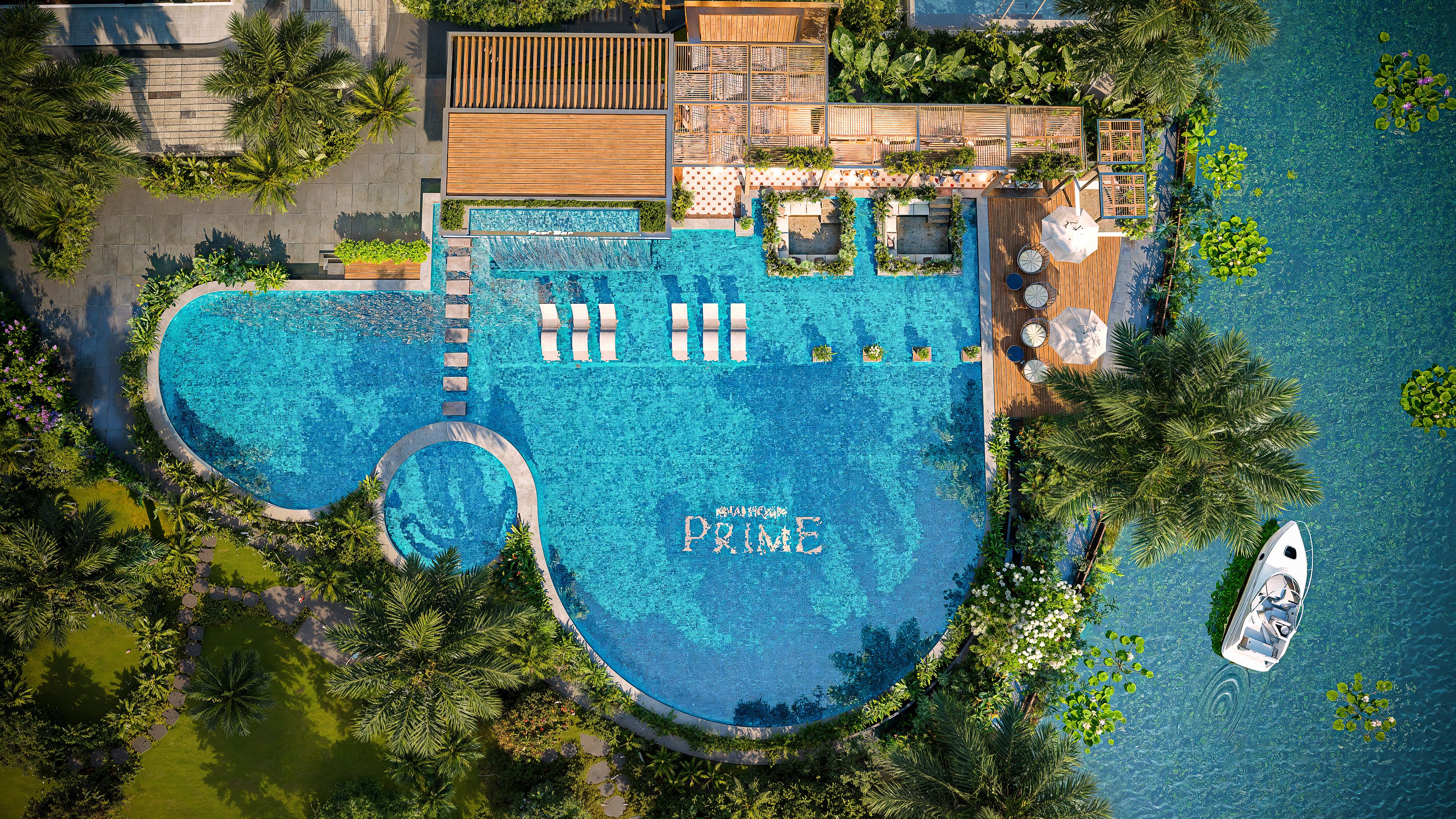 Hồ bơi & hồ sục / jacuzzi | Hồ bơi muối khoáng, hồ sục jacuzzi, hồ bơi trẻ em và pool bar ven sông mang lại cảm giác nghỉ dưỡng. |