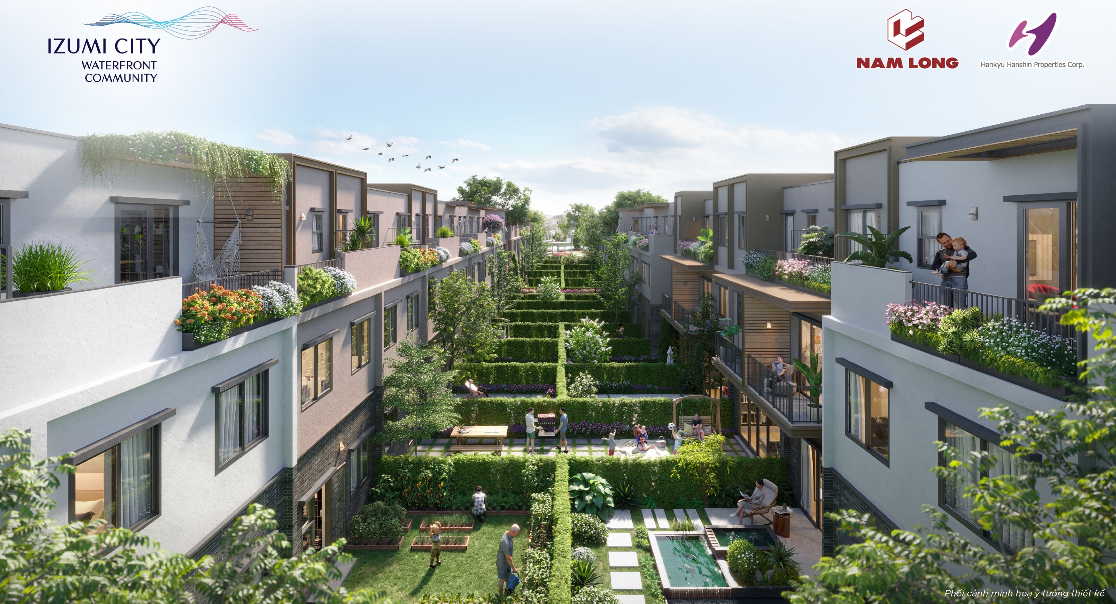 Izumi Canaria được quy hoạch theo mô hình “phố liền vườn – đường cạnh sông”, tức mỗi dãy nhà đều: