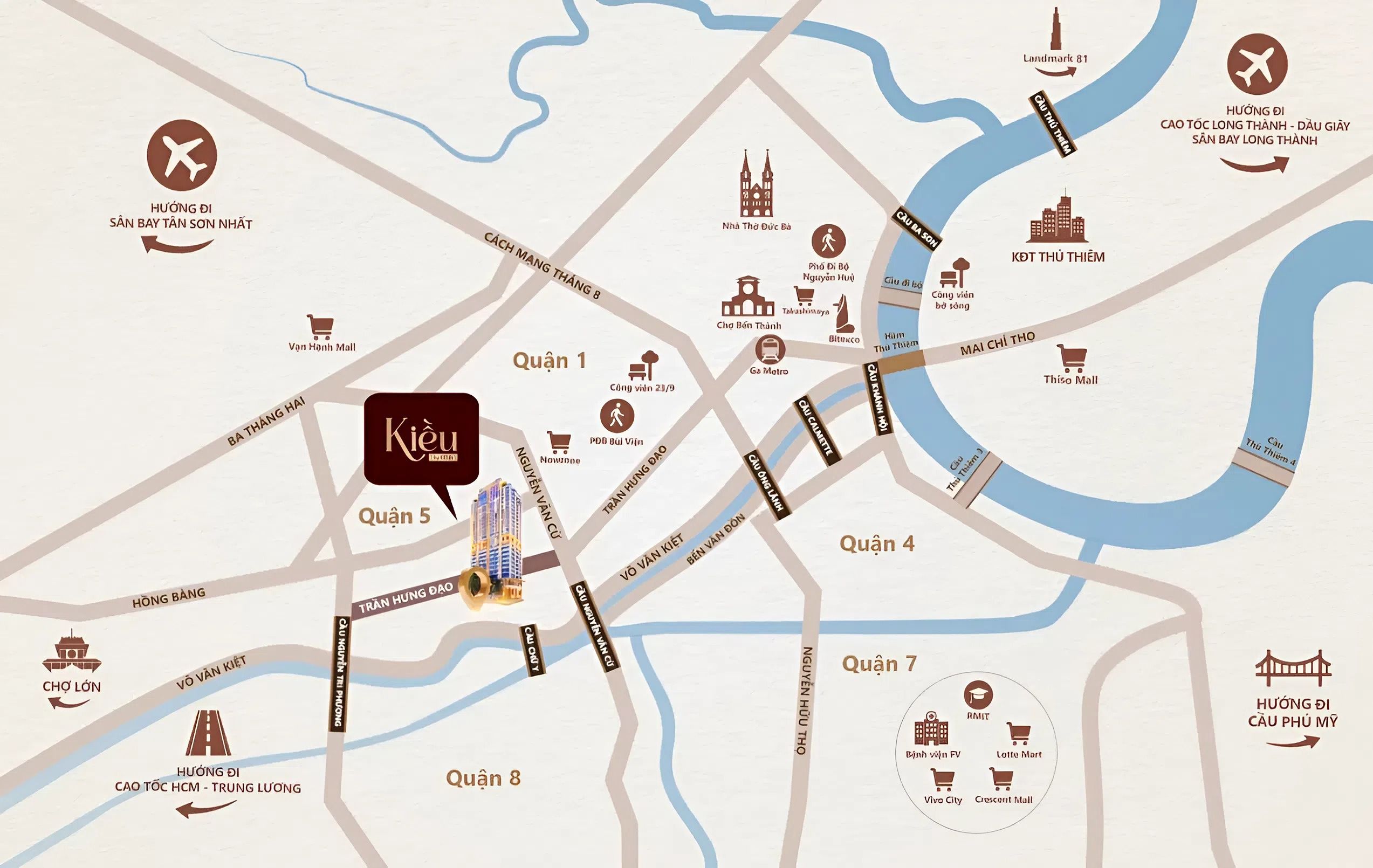 Kiều by KITA là dự án căn hộ cao cấp tọa lạc trên đại lộ Trần Hưng Đạo – một trong những trục giao thông huyết mạch lâu đời và sầm uất bậc nhất TP.HCM.