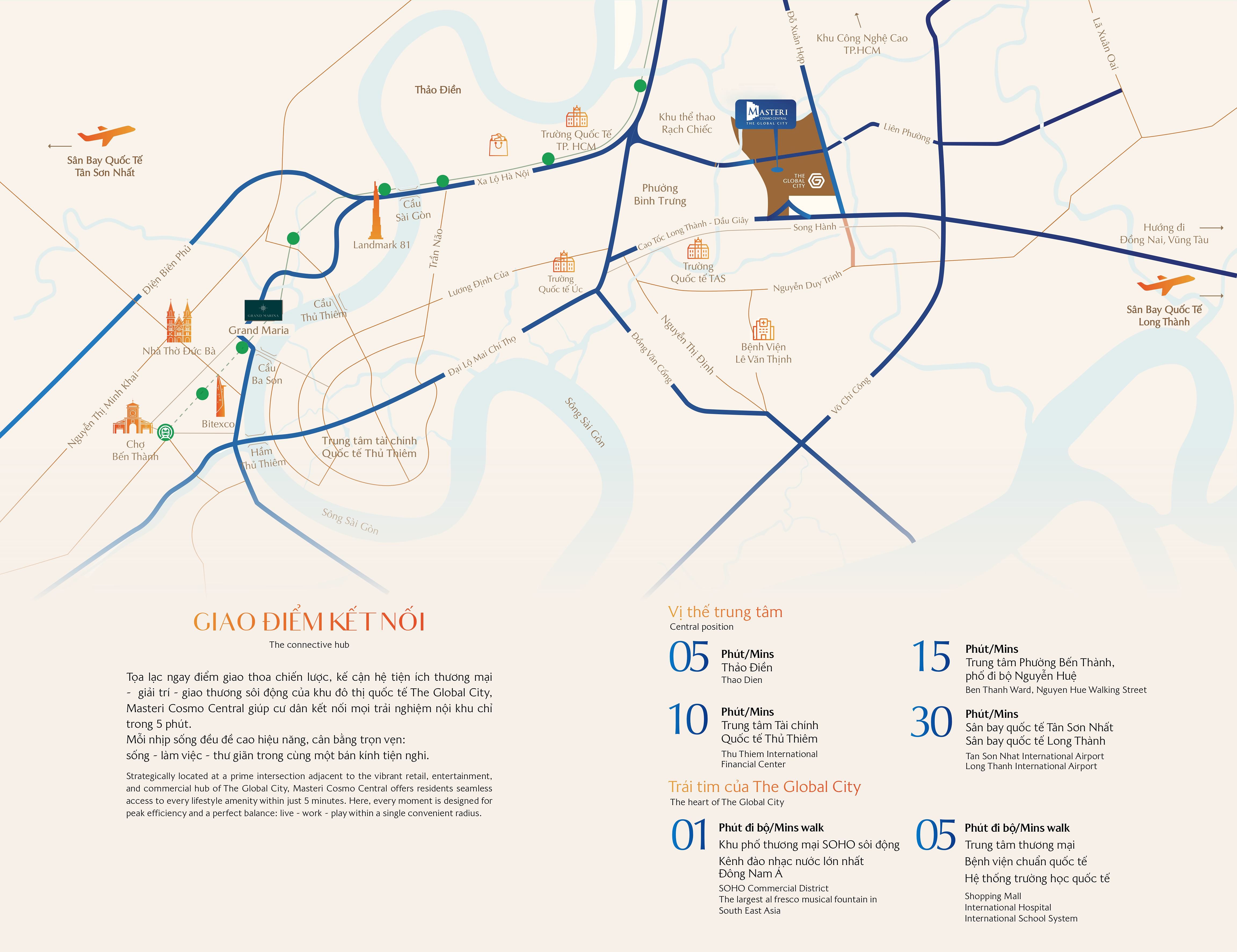 Được phát triển bởi Masterise Homes, Masteri Cosmo Central kế thừa trọn vẹn triết lý quy hoạch “Live – Work – Play” của The Global City – khu đô thị biểu tượng do Foster + Partners thiết kế, định hình chuẩn sống toàn cầu mới tại TP.HCM
