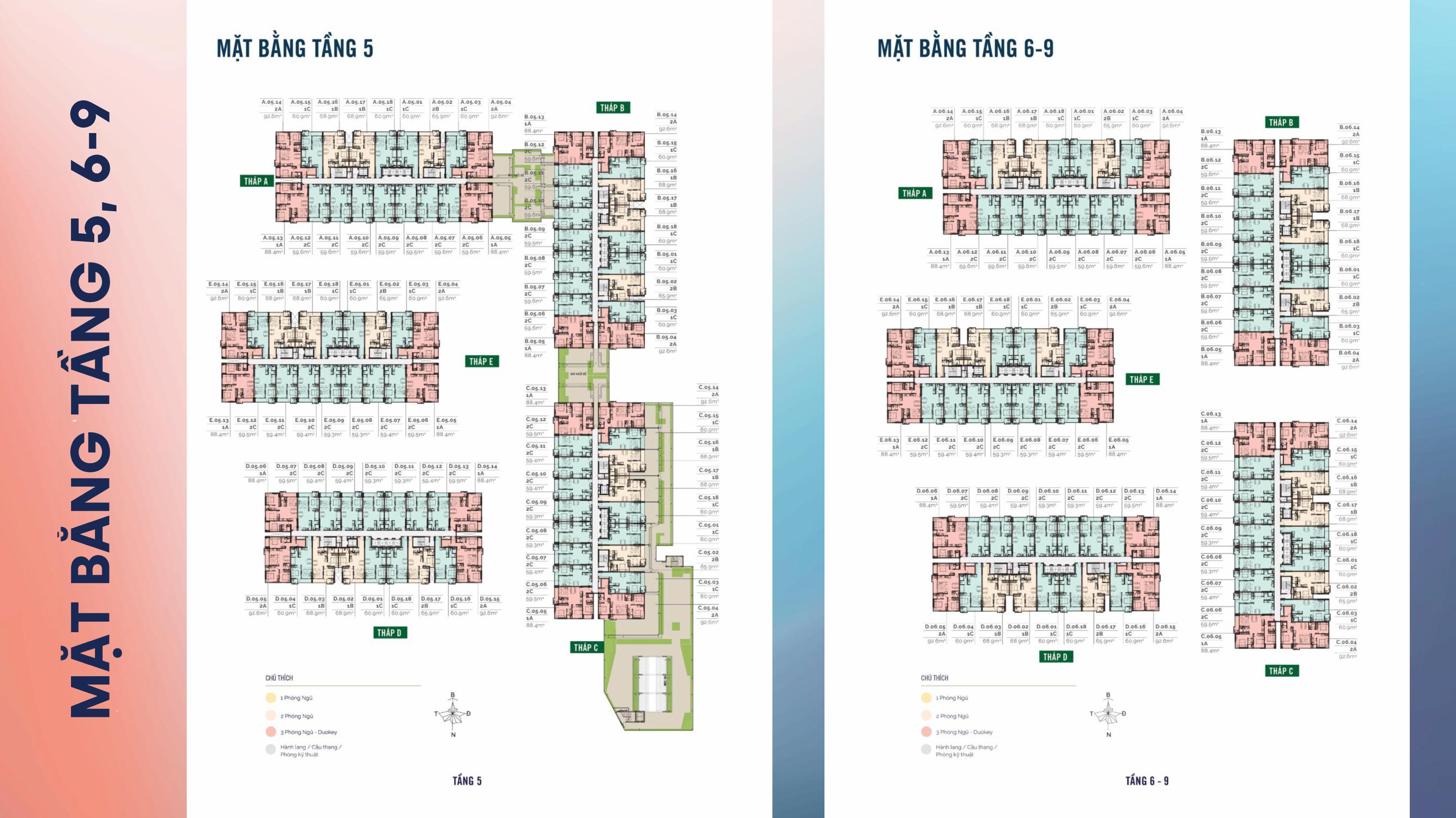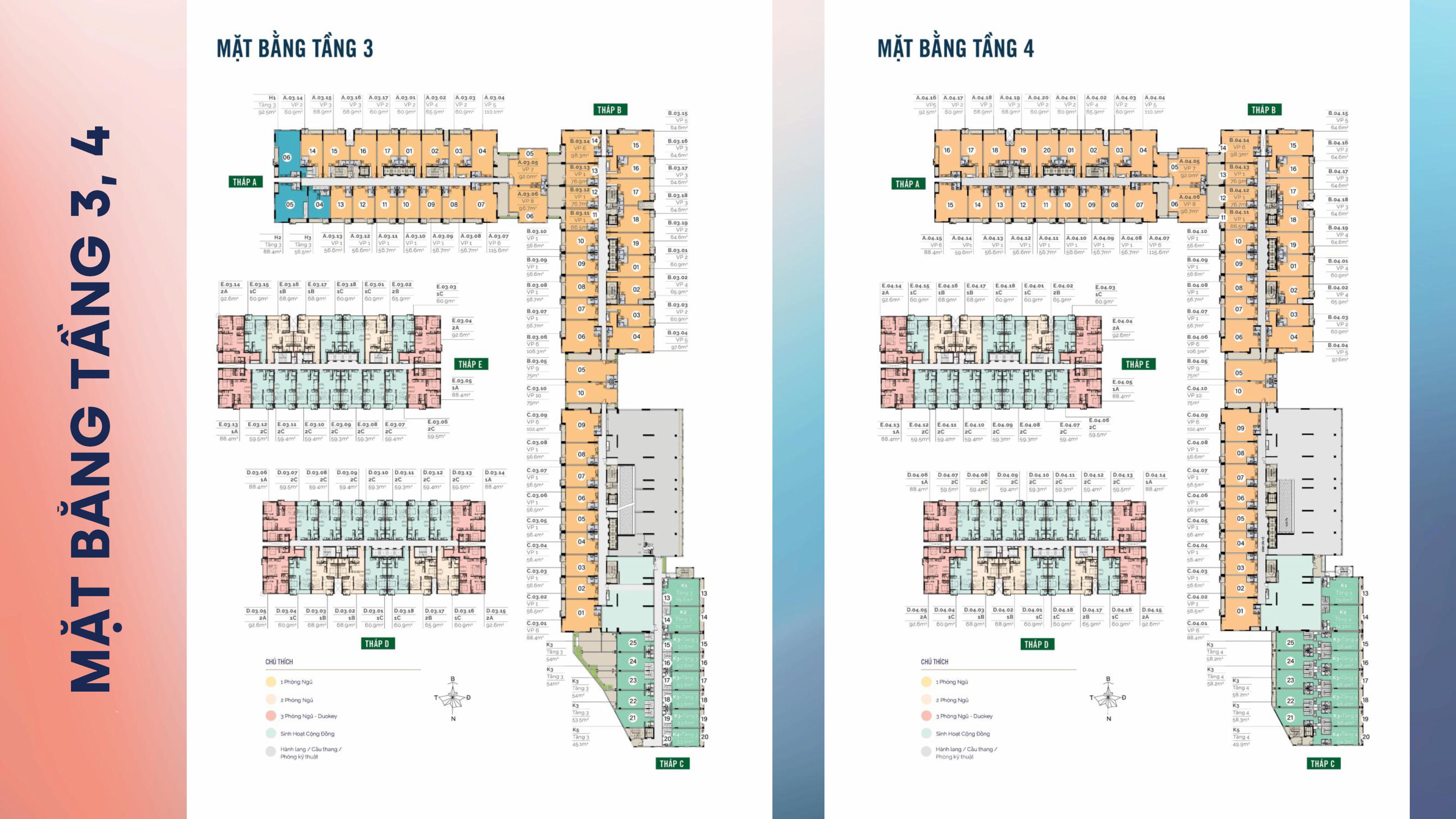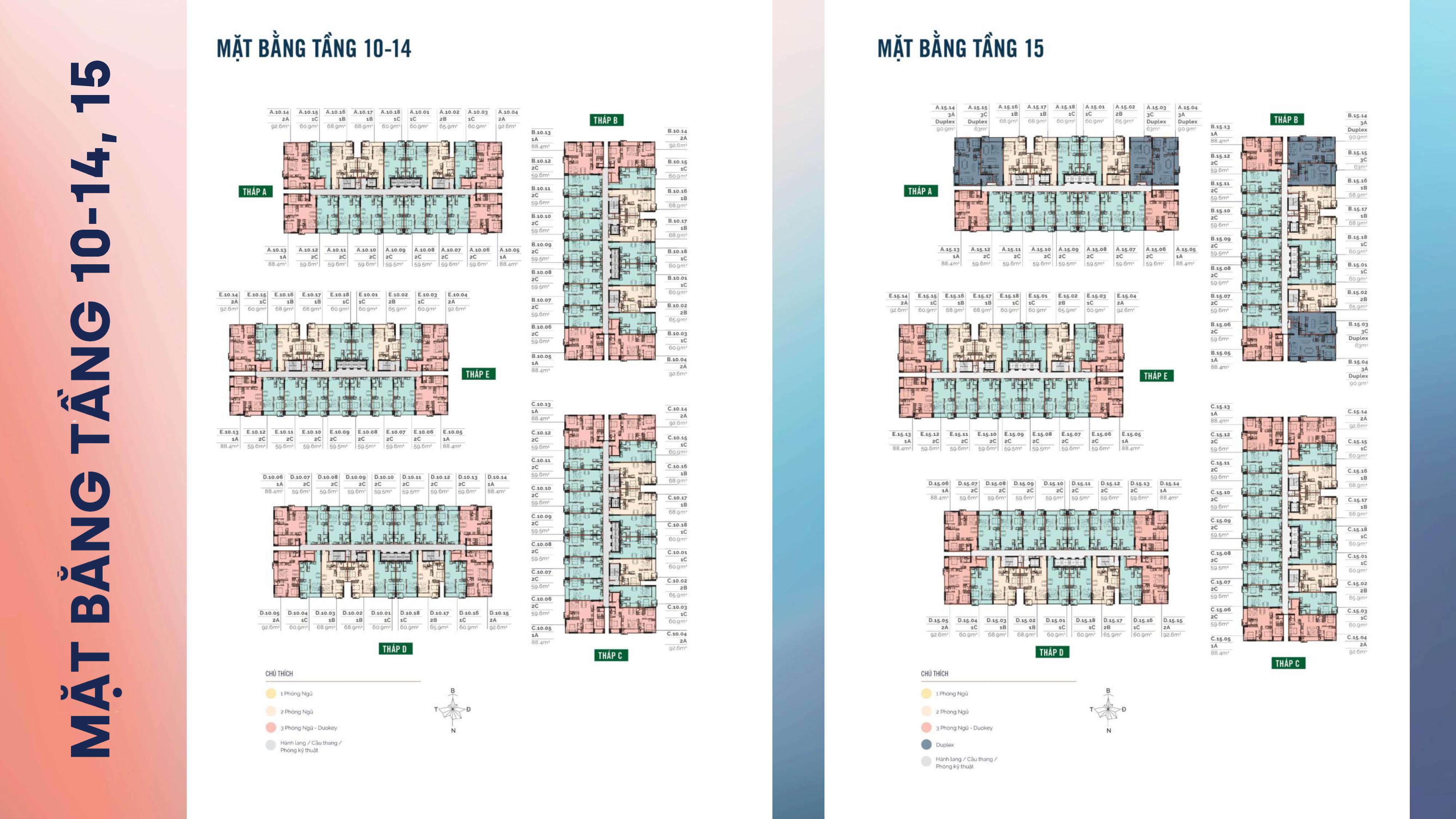 | Diện tích căn hộ | → 1PN: diện tích 63.36 – 65.35 m2 → 2PN: diện tích 70.22 – 73.39 m2 → 3PN: diện tích 95.66 – 99.89 m2 → Duplex: diện tích 134.98 – 195.50 m2 |