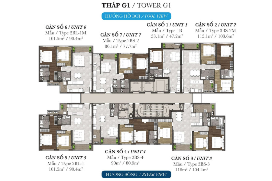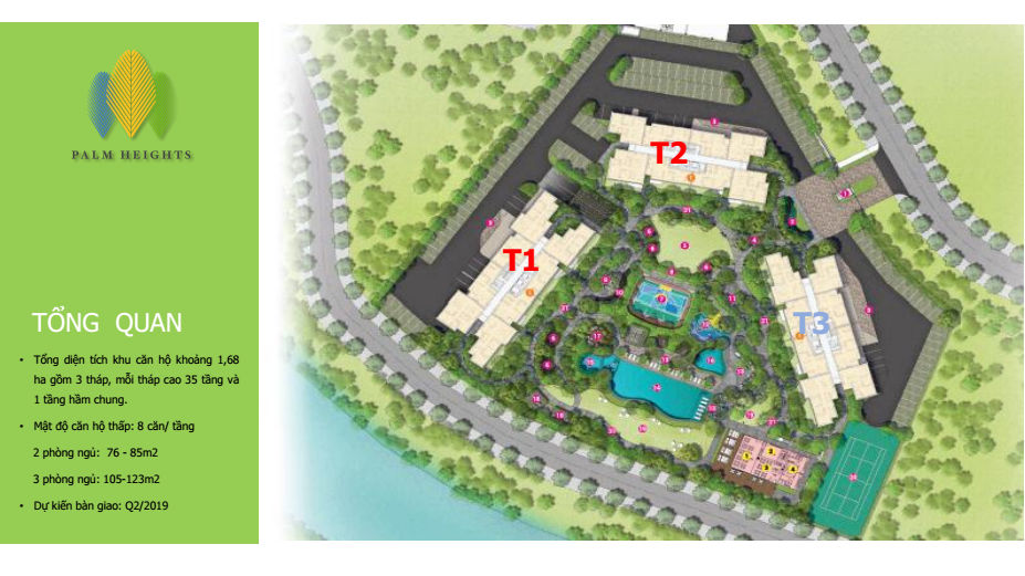Palm Heights là phân khu căn hộ cao tầng gồm 816 căn hộ bố trí trong 3 tòa tháp cao 35 tầng, mỗi tầng chỉ 8 căn. Căn hộ có thiết kế 2–3 phòng ngủ, diện tích từ 76–123 m², tối ưu ánh sáng tự nhiên và tầm nhìn sông thoáng rộng.