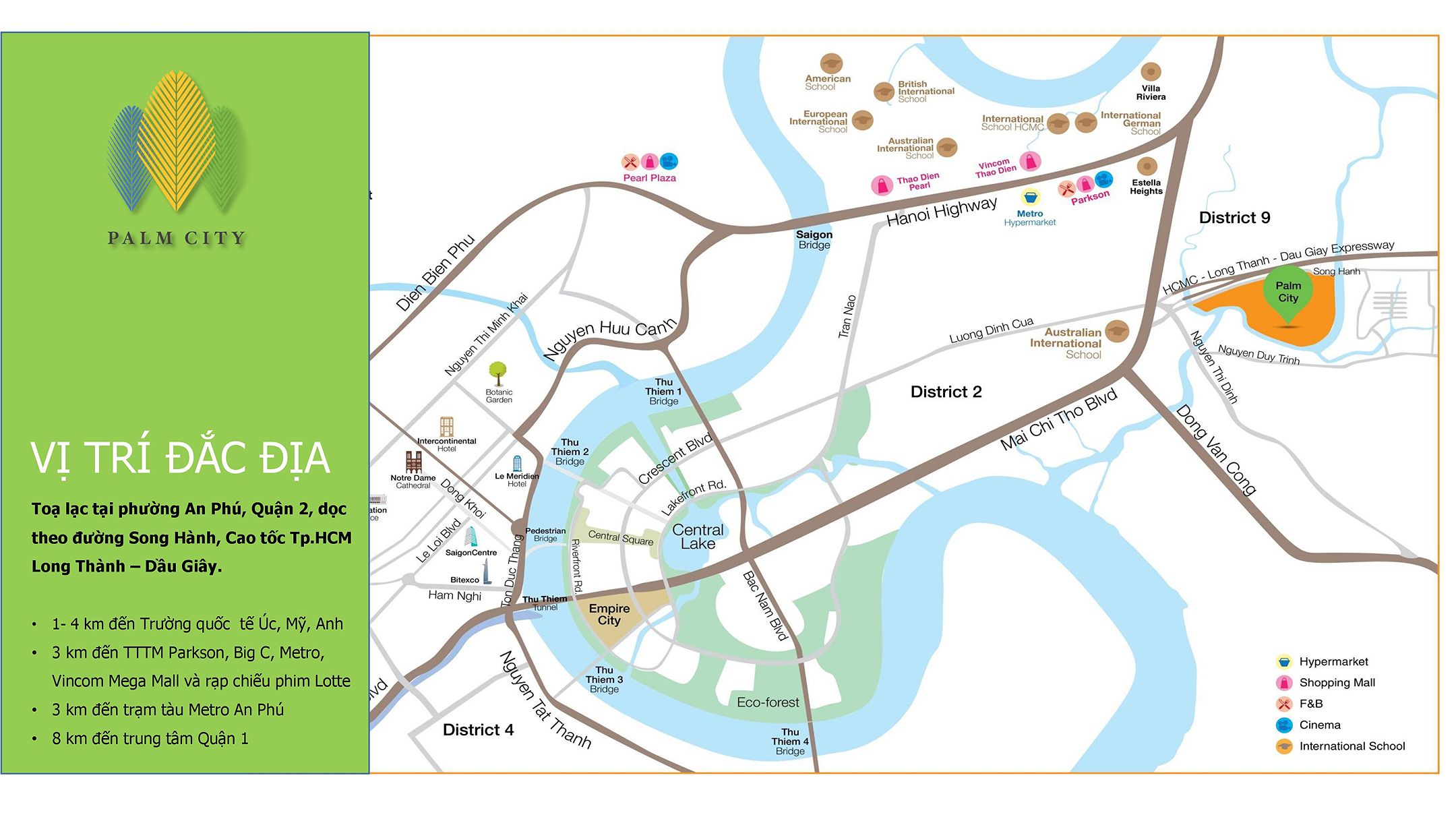 Palm City tọa lạc ngay đường Song Hành cao tốc Long Thành – Dầu Giây, phường An Phú, trung tâm khu đô thị Nam Rạch Chiếc.
