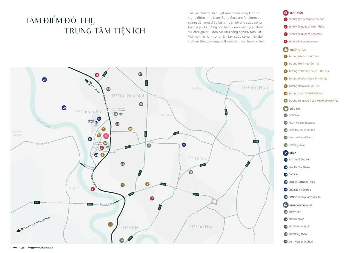 Tâm điểm liên kết vùng: Từ Setia Edenia, cư dân dễ dàng di chuyển và kết nối nhanh chóng đến các trung tâm kinh tế trọng điểm như TP. Thủ Dầu Một, TP. Dĩ An, và đặc biệt là TP. Hồ Chí Minh (chỉ mất khoảng 30 phút di chuyển).