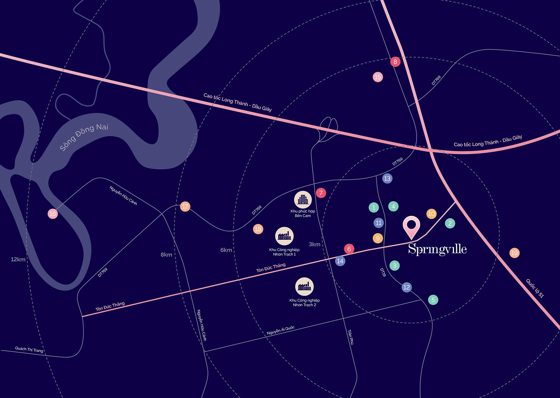 Spring Ville sở hữu vị trí chiến lược ngay mặt tiền đường Tôn Đức Thắng (25B) – trục giao thông huyết mạch của Nhơn Trạch, kết nối nhanh đến các khu vực trọng điểm:
