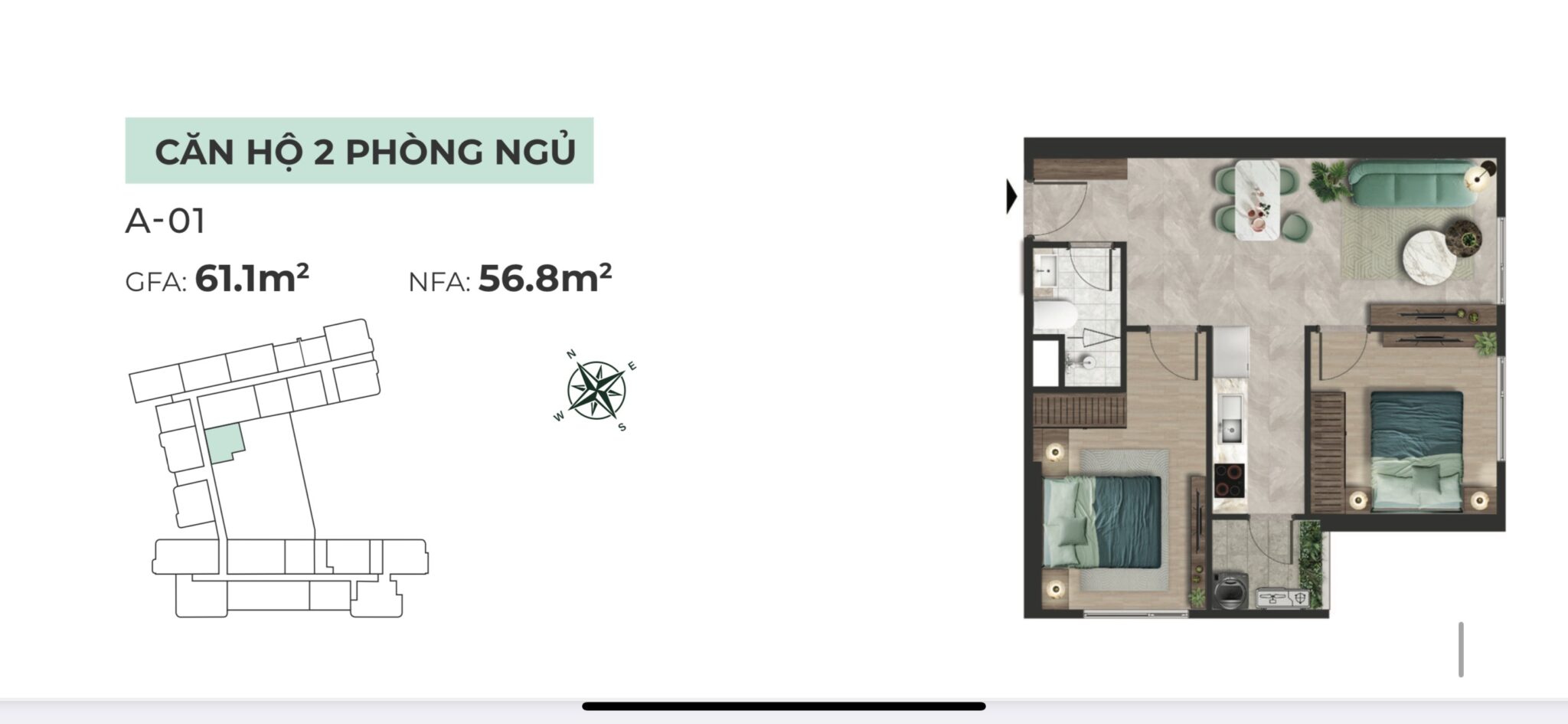 Cơ cấu sản phẩm từ 1–3 phòng ngủ, có thêm penthouse & một số loại căn góc, đáp ứng nhu cầu từ người độc thân, gia đình trẻ đến gia đình nhiều thế hệ. Diện tích tham khảo khoảng 36 – 115 m², focus mạnh vào dòng căn 2PN–3PN cho nhu cầu ở thực.