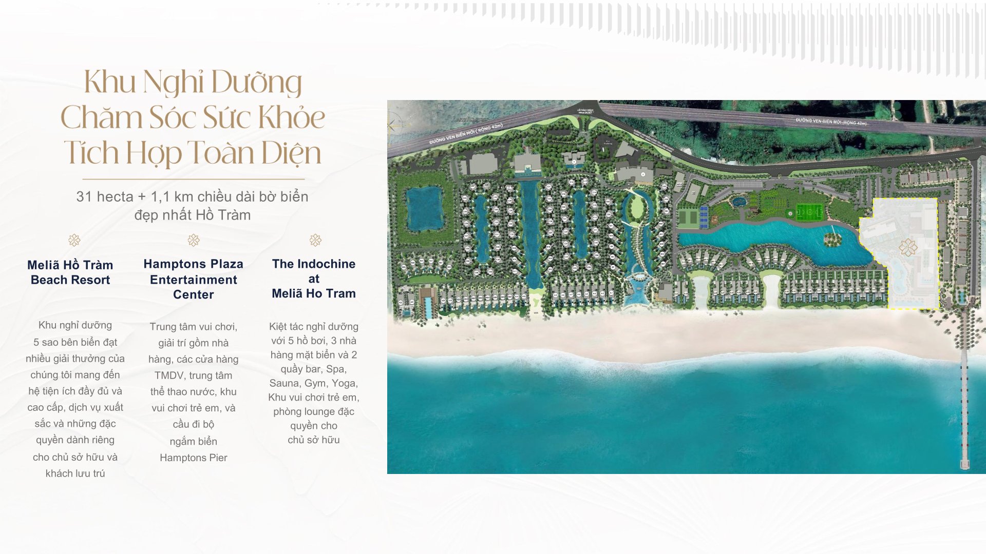| Cấu trúc dự án | 1. Meliá Hồ Tràm Beach Resort2. Hamptons Plaza & Entertainment Center3. The Indochine at Meliá Hồ Tràm |